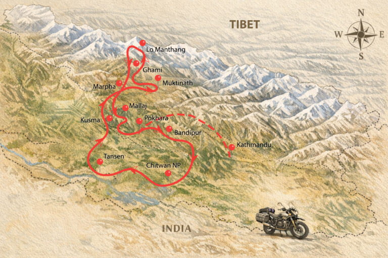 Acelerar pelo Mustang Valley é cruzar os portões de um dos territórios mais fascinantes e remotos do planeta. Cravado no coração do Himalaia, o antigo ‘Reino Proibido’ do Nepal oferece um cenário dramático e de beleza crua: desfiladeiros profundos, picos nevados, monastérios seculares esculpidos nas rochas e a imensidão árida do planalto tibetano. Esta é uma expedição desenhada para motociclistas que buscam a verdadeira essência da exploração. Um roteiro onde o desafio magnético da pilotagem em altitude se encontra com uma herança cultural milenar, recompensando cada quilômetro superado com vistas arrebatadoras do teto do mundo. Prepare-se para uma jornada de superação e pura conexão com a montanha. Tour realizado com motos alugadas no Nepal!