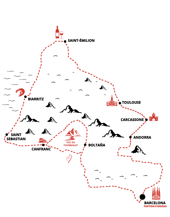 Partindo de Barcelona, capital da Catalunha, vamos pilotar pela costa brava e pelas pitorescas ruas de Girona até chegar na base dos Pirineus. Após visitar Andorra, seguimos para a França rumo a cidade medieval mais preservada do mundo, a famosa Carcassone. Ficaremos hospedados dentro da cidade medieval por duas noites, onde iremos vivenciar como era a vida neste lugar histórico! Então seguiremos para a região de Bordeaux, mais especificamente a charmosa Saint Emilion. Nesta região incrível teremos dois dias inteiros para visitar vinícolas e desfrutar da região. Nossa viagem segue de volta para a Espanha, mas no caminho vamos almoçar e passar a tarde na badalada e cultural cidade de Biarritz. Já no país Basco, vamos ter duas noites em Saint Sebastian, a litorânea e charmosa cidade conhecida por seus chefs de cozinha inovadores. Para fechar nosso tour com chave de ouro, passaremos três dias completos percorrendo as curvas e passos dos Pirineus! Vamos pilotar tanto pela parte francesa como pela espanhola, experimentando o melhor de suas hospedagens e culinária, tudo isso regado a muito vinho! Esta é uma experiência incrível que reune alta gastronomia, ótimos vinhos, paisagens inesquecíveis, estradas espetaculares e muita cultura. Tour realizado com motos alugadas na Espanha.