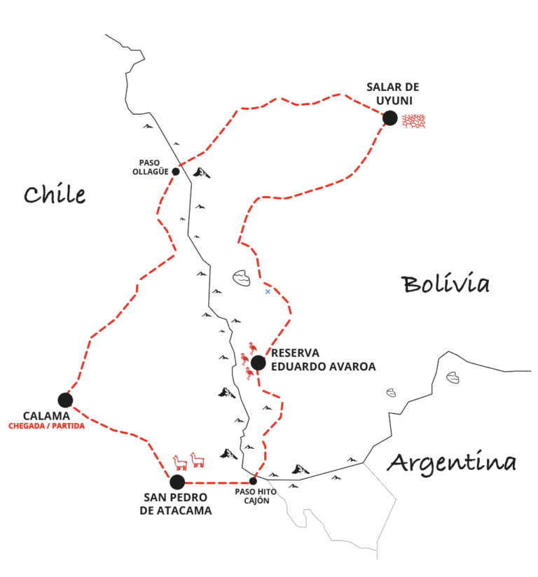 Neste tour vamos pilotar por uma das regiões mais inóspitas do altiplano Boliviano! Saindo do Chile (deserto do Atacama), vamos cruzar para a Bolívia pelo Paso Ollague sentido Uyuni. Nesta travessia já vamos enfrentear altitude acima de 4.000 mts e pilotar por lugares incríveis! O cenário se mostra por vários tons de marrom e laranja das montanhas contrastando com o céu azul límpido! No salar de Uyuni, maior deserto de sal do mundo, você terá a experiência de pilotar por um lugar onde a vista não alcança o fim. Localizado no altiplano Boliviano, Uyuni reserva paisagens incríveis e ilusões de ótica divertidas. Teremos 1 dia inteiro no Salar onde vamos pilotar até a Ilha Incahuasi, famosa por seus cactos gigantes e centenários. Seguimos viagem para nosso grande desafio: cruzar o Parque Nacional Eduardo Avaroa, um local ermo e inóspito, porém que reserva paisagens surreais! Serão 2 dias pilotando por essa região até alcançarmos a fronteira com o Chile. Vamos conhecer a Laguna Colorada, Laguna Verde, Árbol de Piedra e outras atrações da região. Nesta travessa vamos nos hospedar em um hotel/refúgio a mais de 4.600 mtes de altitude, em uma região no meio do nada! Esse tour exige nível avançado de pilotagem Off Road e excelente condicionamento físico devido a altitude que vamos enfrentar. Essa é uma viagem perfeita para quem busca aventura, superação e pilotar por lugares que poucas pessoas se atreveram desafiar! Tour realizado com motos alugadas no Chile.